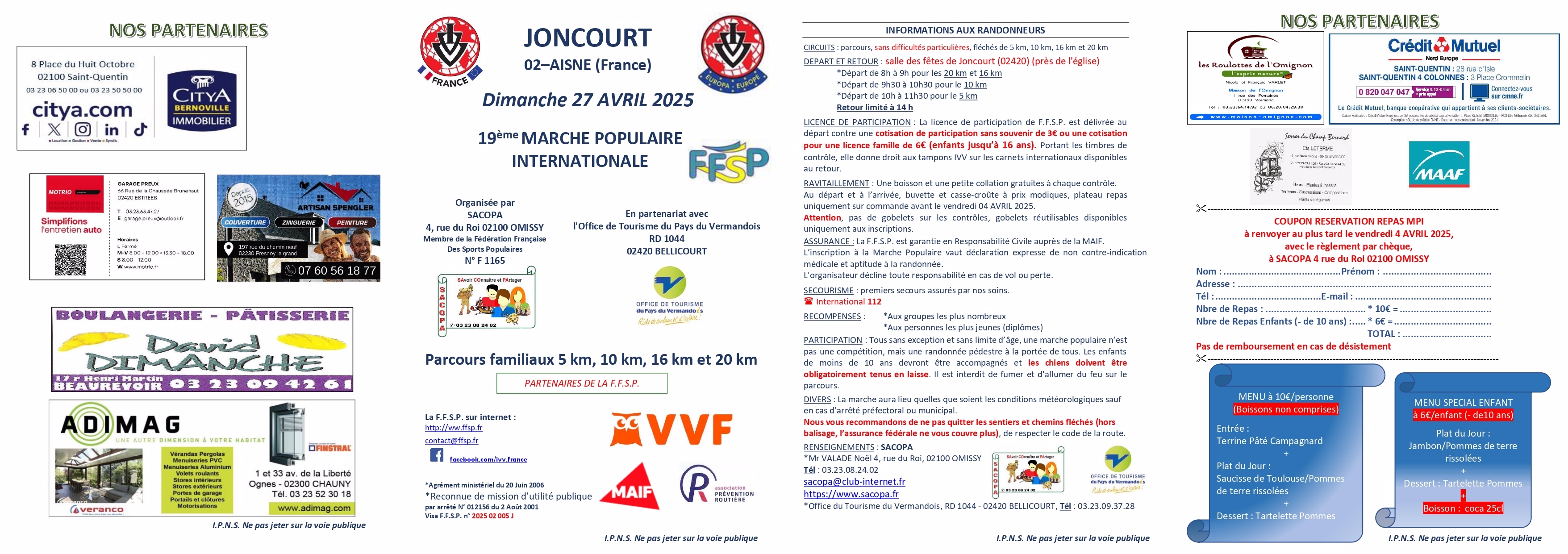 Le président Noël Valade remercie vivement la municipalité de Joncourt, tous les participants à la 13ème MPI et tous les bénévoles qui ont permis par le balisage, les points de contrôle, la restauration, la réussite de cette journée, nos différents partenaires.