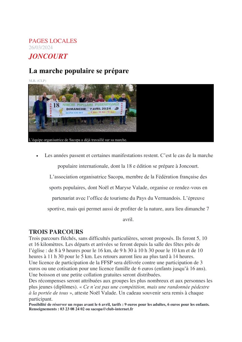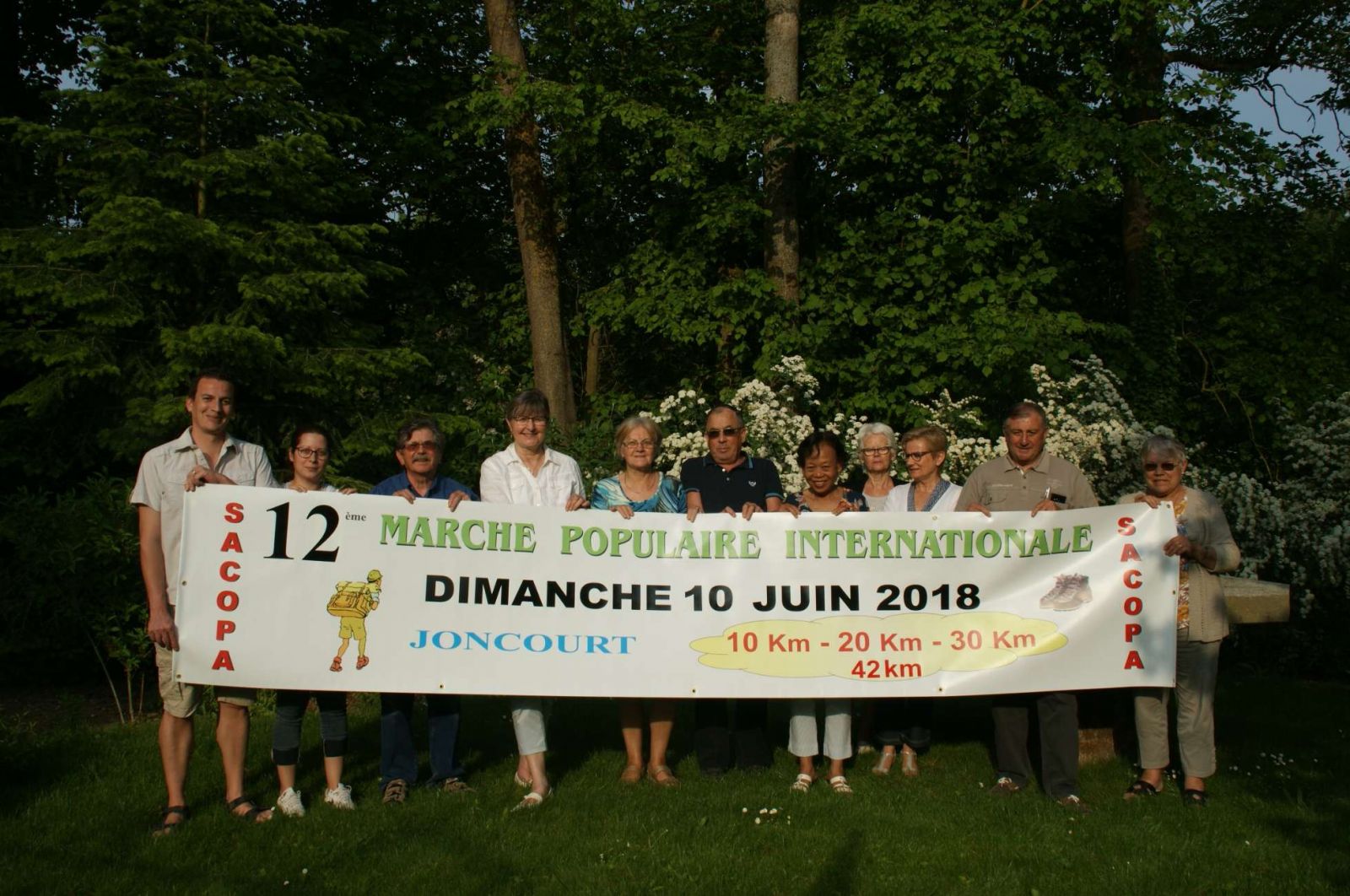 La marche populaire annuelle approche. Ce sera le dimanche 16 juin prochain la 13e édition de cette manifestation organisée par l’association Sacopa, dont le siège est situé à Omissy, en partenariat avec la FFSP et l’office de tourisme du Vermandois. On ne change pas les habitudes, la marche partira de Joncourt puisque la municipalité prête toujours sa salle polyvalente, avec un grand parking devant pour accueillir les participants. Les adhérents et les bénévoles qui gèrent cette épreuve ont fait leur réunion préparatoire le 24 mai dernier, sous la présidence du président de Sacopa, Noël Valade, un chevronné des randonnées avec son épouse. Il fut mis au point les ultimes détails de cette marche pour que rien ne cloche.
